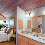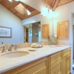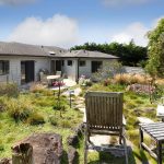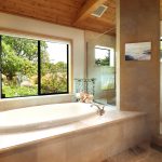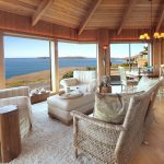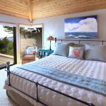 The custom chef’s kitchen features ample natural wood cabinets, stone counters, built-in appliances, and a walk-in pantry. The spacious ocean view primary bedroom has a spa bath en suite that includes a jetted soaking tub, stall shower, spacious dual sink vanity, a walk-in closet, and gorgeous stone floors. 2 additional bedrooms share a thoughtfully designed full bath. A laundry room and powder room complete the sleeping wing of this single-level home. The generously sized central stone clad hallway leads to the back garden that hosts a wind-protected stone patio for entertaining al fresco.