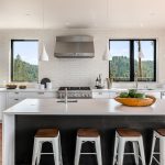 - Central island with waterfall edge quartz counter hosts an under-mount stainless steel sink with faucet two pop-up electric receptacles, and breakfast bar seating