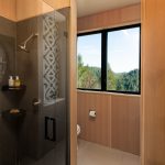 - Steam room, serviced by Coasts steam generator, features black honeycomb tile, wood bench and a smoked glass door