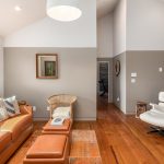 - Vaulted ceiling features an oversized Schoolhouse pendant light