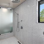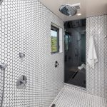 - Walk-in shower is clad with white honeycomb tile and features two Grohe rainfall shower heads, Grohe shower controls and a Grohe handheld showing wand