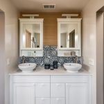 - Two mirrored medicine cabinets illuminated by LED bar lights
